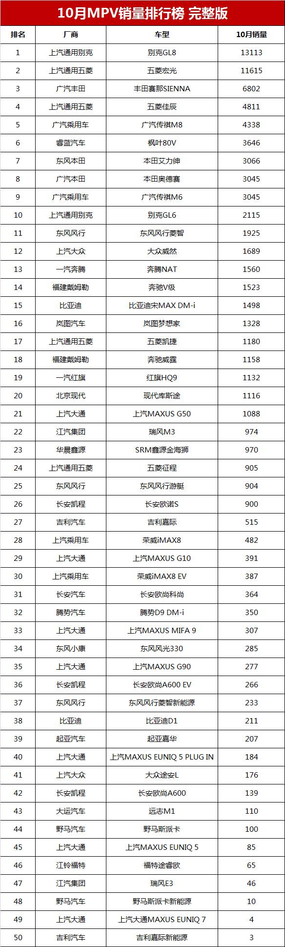 2024年11月全國合資MPV銷量排行榜完整版(零售量