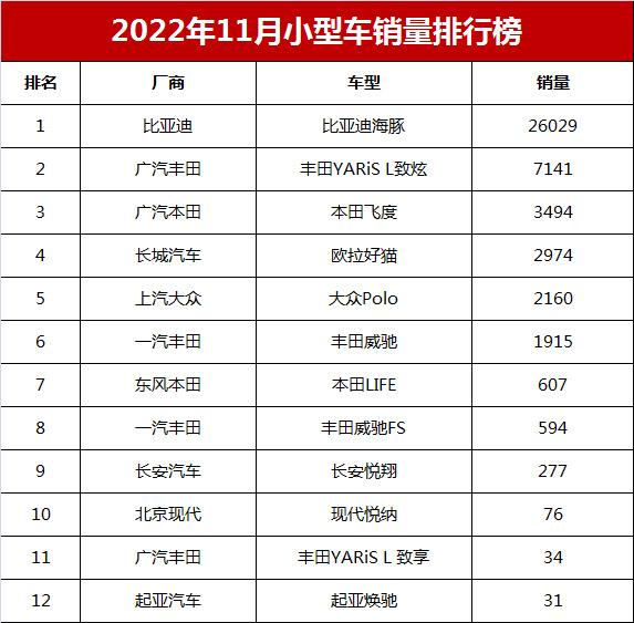 148 次2022年11月小型車銷量排行榜(零售