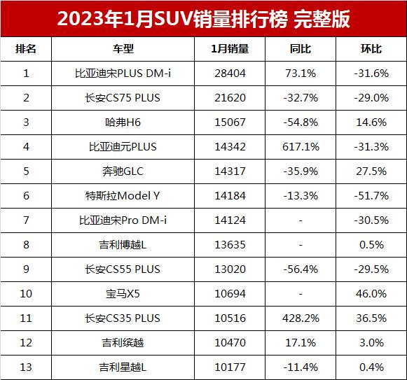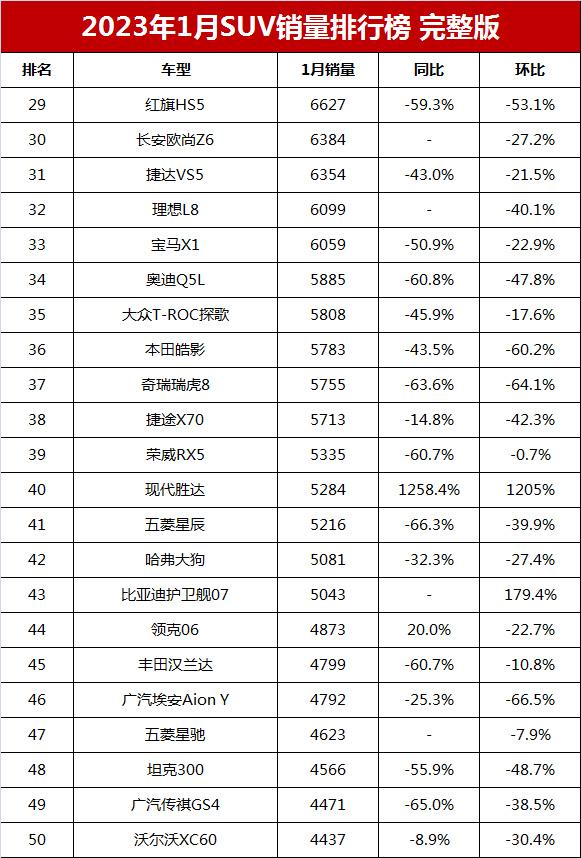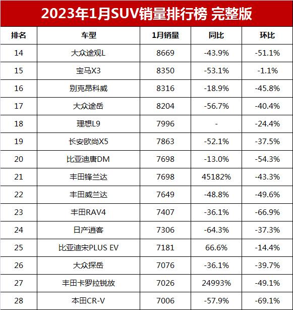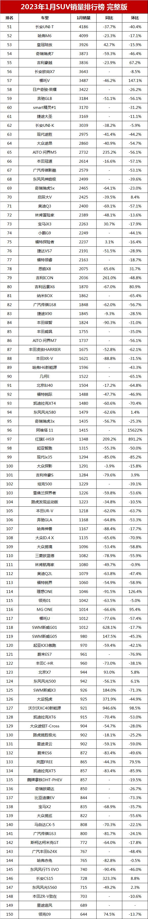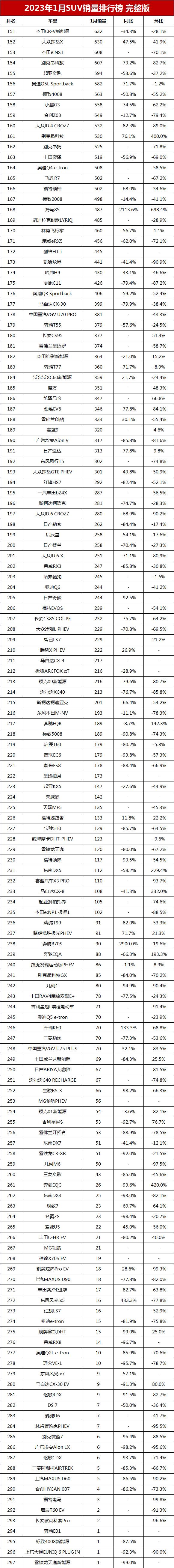 172 次2024年1月全國SUV銷量排行榜完整版(批發量