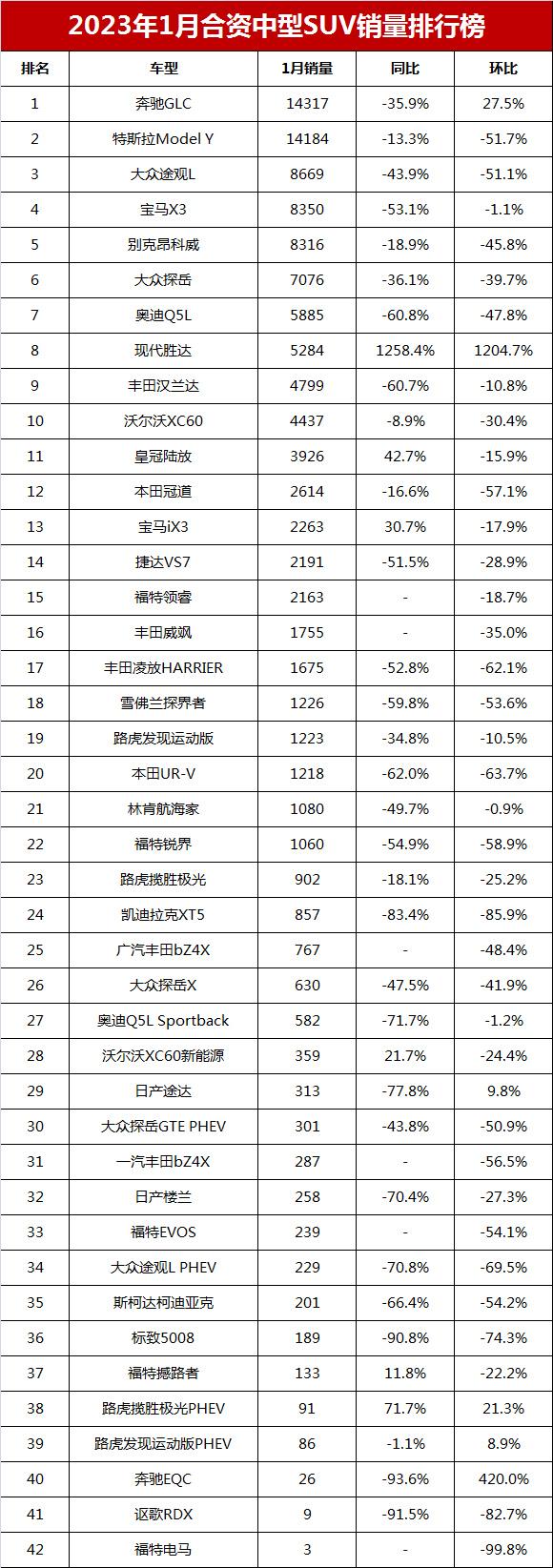 208 次2024年1月全國合資SUV銷量中型車排行榜完整版(出口量